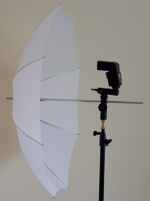 - An umbrella swivel or “tilthead”. This gizmo fits onto the light stand and has a hot shoe which allows you to slide a flashgun onto it. The model I use, the Lastolite Tilthead with Hotshoe which also swivels allowing you to point your flash up and down and has a socket allowing you to mount an umbrella which will tilt with the flash. An umbrella is referred to as a “light modifier” because it diffuses the light and gives a softer effect than the “bare flash” (i.e. no light modifiers). So, you’ll need the next item as well.