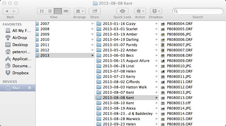 Folders on the back up drives are named in the format <date> <name> where <date> is in the form yyyy-mm-dd and <name> is any meaningful name for the shoot (e.g. the location, client name etc). So for example 2014-01-03 Warwickshire. Folders always appear in sequential order over the year. These folders are further categorised into a year folder and finally into a top level folder called RAW (I also have a Subject folder, see Step 6). So the complete folder structure for the above file would be RAW/2014/2014-01-03 Warwickshire. The image below shows the folders on one of my backup drives.