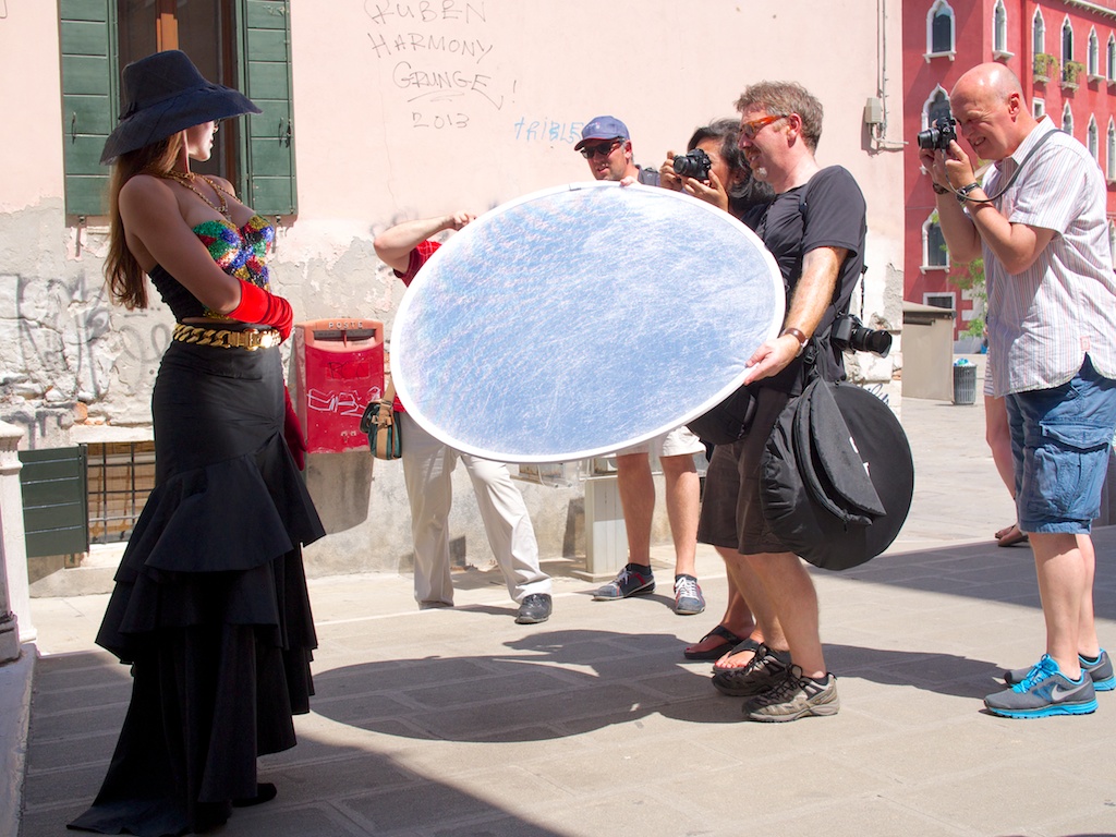 Neil has put his own post of the trip, The Hunter and the Fisherman – Venice 2014 on his blog. Finally here are our two mentors in action on the streets of Venice, Neil holding the reflector and Steve taking one of his rare photographs of “something that moves”.