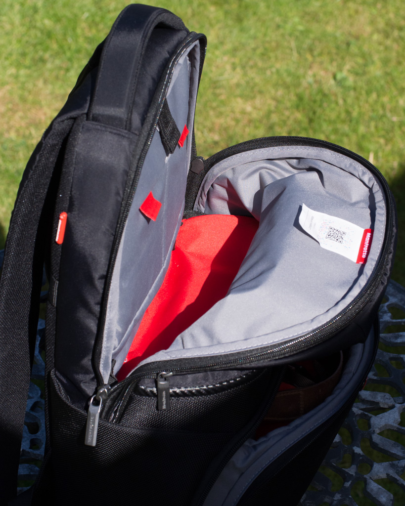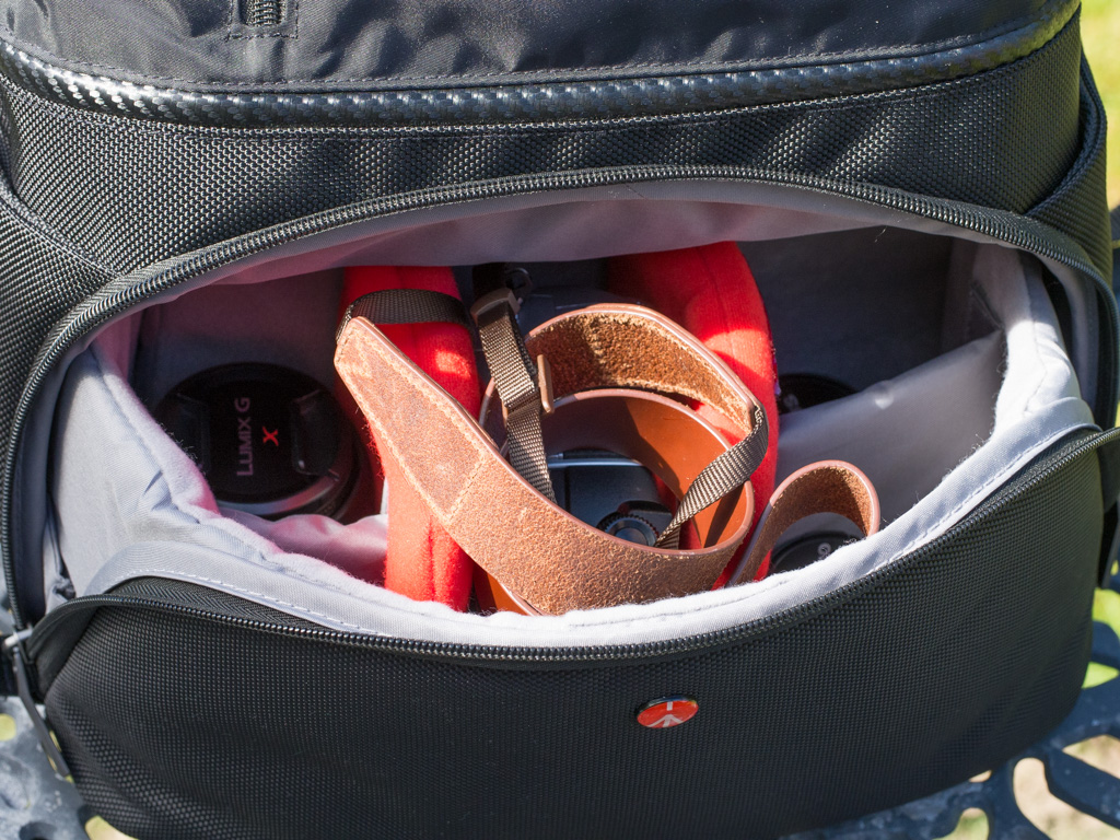 The camera and lens carrying space handily pulls out a bit like a tray and has reconfigurable dividers. So far the default layout works perfectly for me.