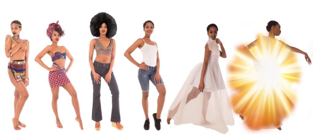 At the beginning of March I worked with Dawn to create one of the publicity shots for this years show whose theme is “Zimbabwe 2030, a glimpse into the future”. The brief was to create a composite image showing five styles of fashion over a period of time with a final, sixth image putting out the question what will fashion look like in 2030? To create the image we worked with the model Linda Ndiweni in different outfits with the plan being to Photoshop them together into a composite.