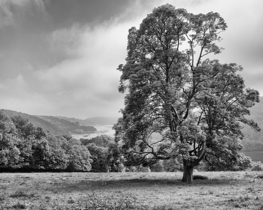 This tree is close to where I walk every time I stay in Devon. It has an enviable view over the Dart estuary and in the summer offers shade to the cows and sheep that are often to be found in its field. I find I am drawn to making pictures of this tree and its surroundings whenever I walk by, capturing how it changes with the seasons. Here are some of my favourites, taken over the last couple of years.