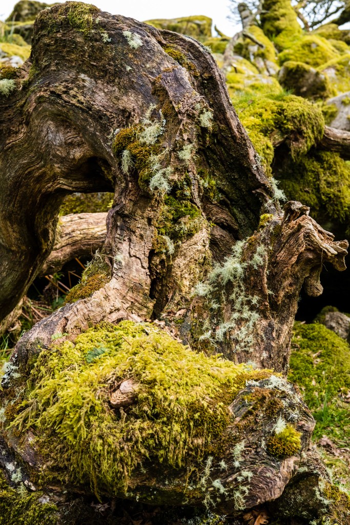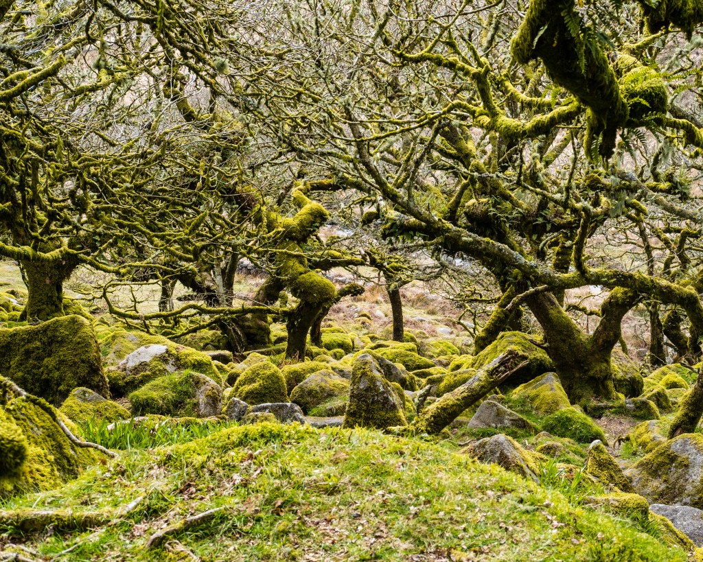 Wistman’s Wood lies on the Eastern slopes of the river Dart in the Dartmoor National Park, Devon. Although covering only 170 hectares (1.7 square kilometres) this amazing woodland is important for the mosses and lichens that cover the trees and huge granite boulders scattered on the forest floor.