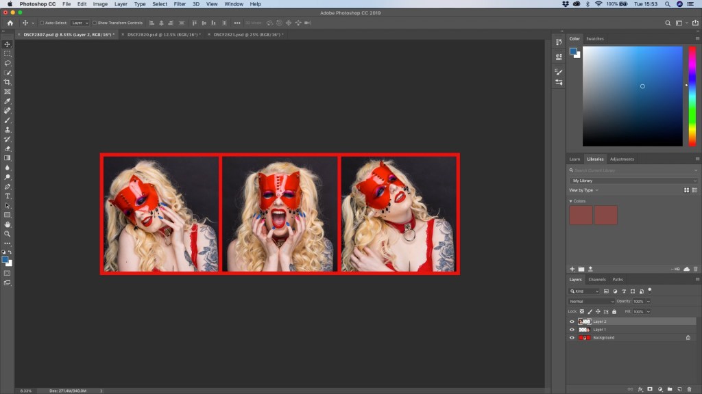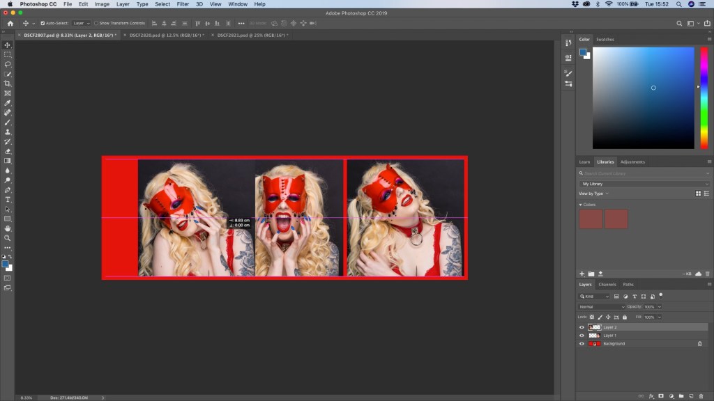 Choose the second image tab then select the image ‘Cmd A’ and copy it ‘Cmd C’. Move to the tab which now has the canvas and paste the copied image with ‘Cmd V’. Repeat this for the third image. The images will open as layers on the canvas but will be laid on top of the centre image.