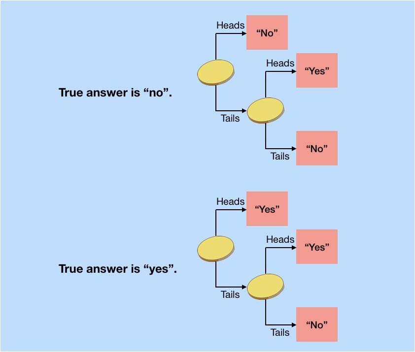 In order to avoid this problem consider the following alternative. Instead of asking people the question directly, first ask them to flip a coin but not to tell us how it landed. If the coin comes up heads they tell us (honestly) if they have driven under the influence. If it comes up tails however they tell us a random answer then flip the coin again and tell us “yes” if it comes up heads or “no” if it is tails. This polling protocol is a simple randomised algorithm which is a form of differential privacy. So how does this work?