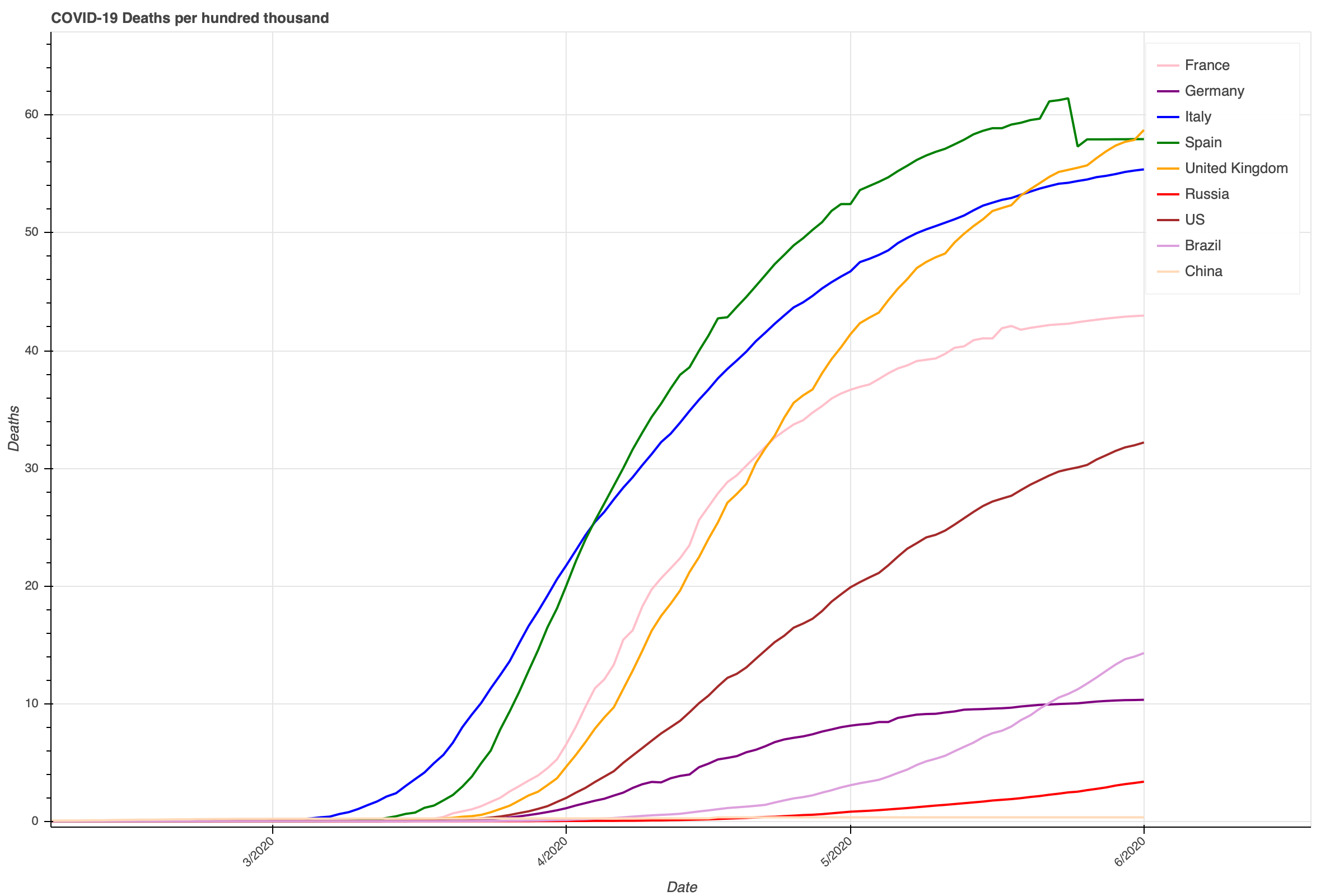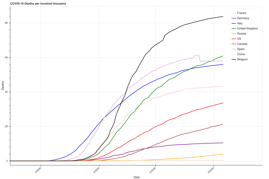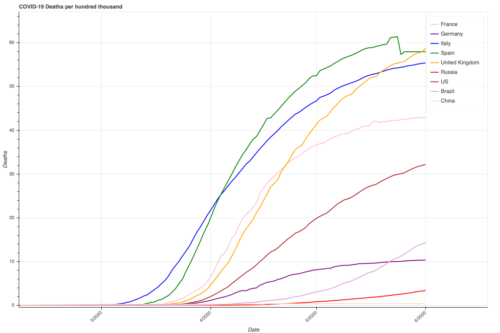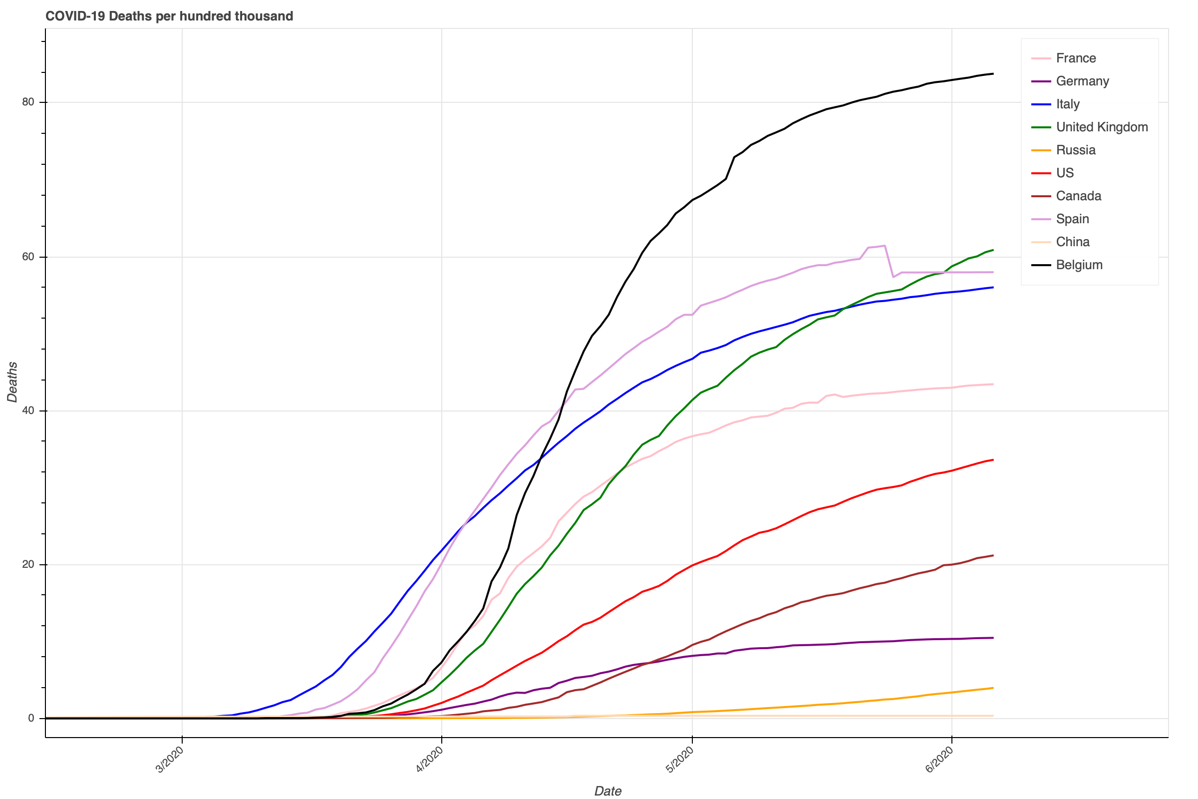 Whilst I have some sympathy with the idea of bringing science and data more to the fore in government you have to ask, if Cummings is forging ahead in creating a dataist civil service somewhere in the bowels of Downing Street, why are our COVID-19 deaths the worst, per capita, in the world? This graph shows the data for deaths per 100,000 of population (2018 population data) for the major economies of the world (using this data source.). You’ll see that as of 1st June 2020 the UK is faring the worst of all countries, having just overtaken Spain.