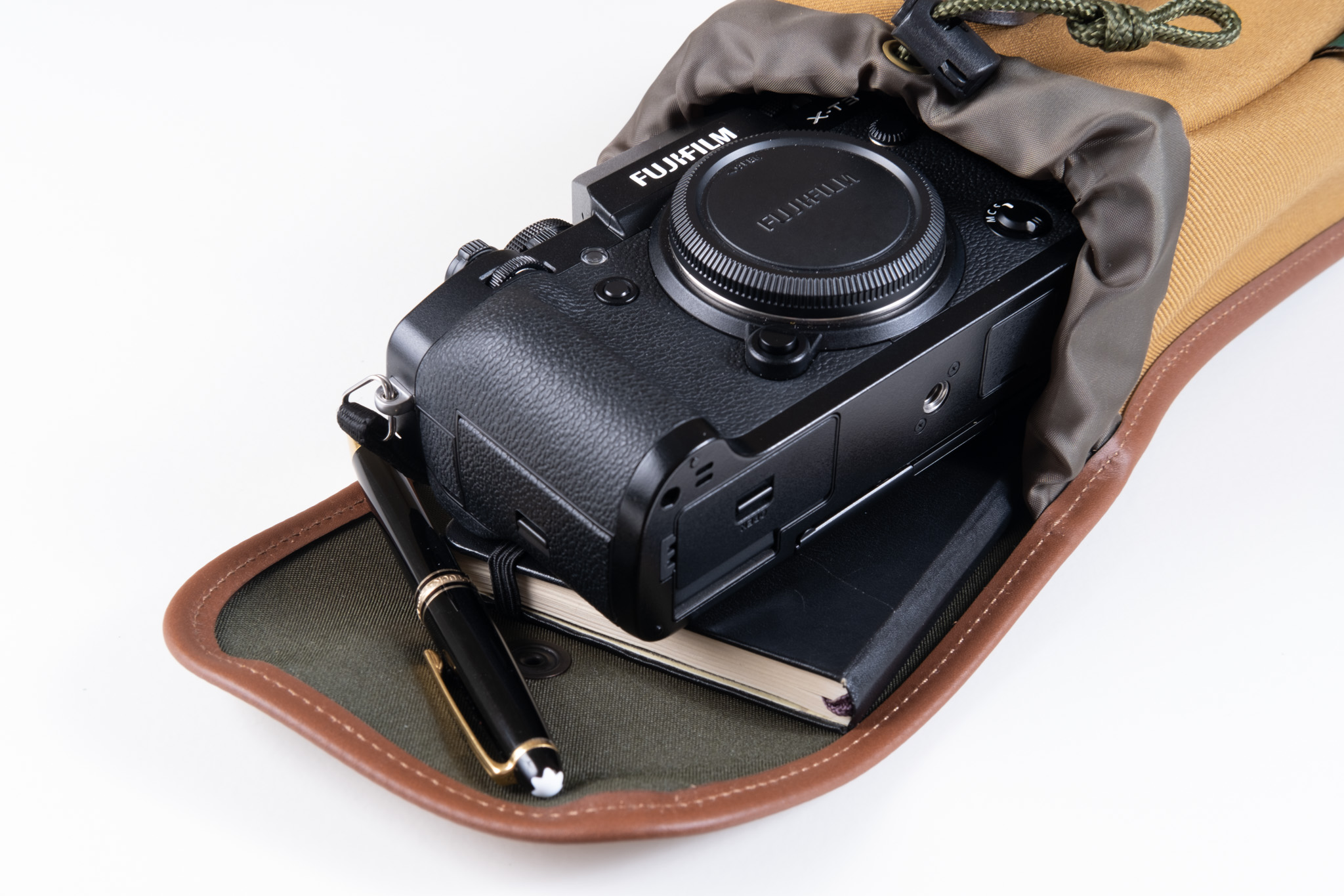 Billingham make four end pockets but the AVEA 5 was the one that was the right size (internal dimensions are: W110mm x D60mm x H150mm) to fit a Fujifilm X-T3/X-T4 or X100F. As you can see from the images below the AVEA 5 nicely fits one body or the X100F. There’s also an internal back pocket that fits a notebook or passport and a drawcord that pulls the internal waterproof layer over the top of the contents.