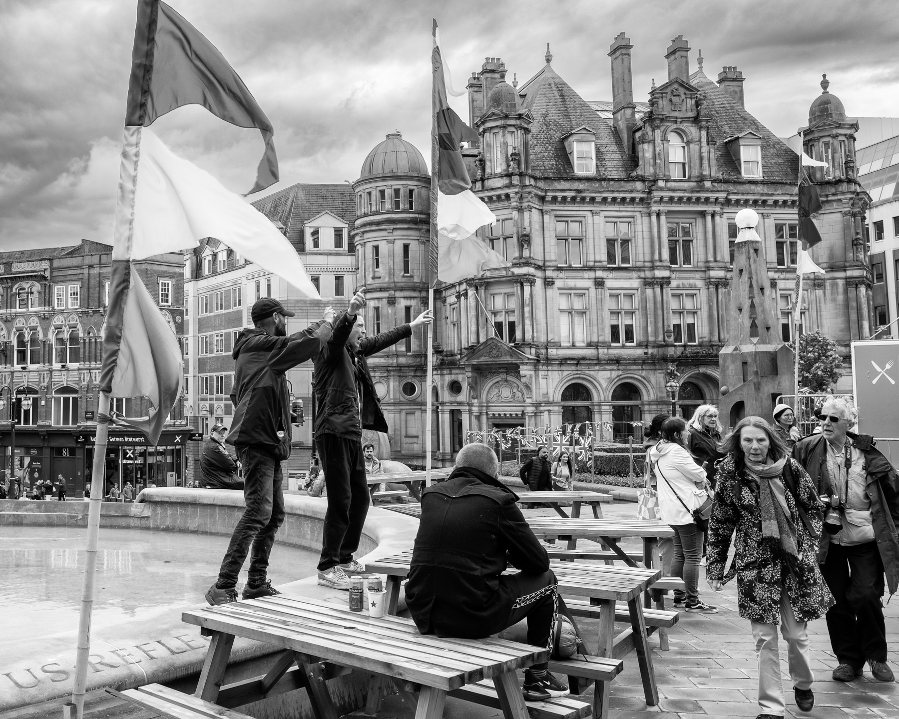 I hung around one of the central squares in the city centre where a temporary marquee had been erected hosting a number of live bands as well as benches to encourage people to sit and watch the proceedings. I’d hoped to get some street images capturing the spirit of the day but the bad weather meant all but the diehard royalists turned out. I snapped various images trying find something of interest including a few of some men who were clearly “merry” from a few too many cans of lager. I would not normally take these kind of images but, to be honest, was getting pretty desperate. Deciding there was nothing of consequence going to happen and having spent several hours wondering around I decided to give up and head for home.