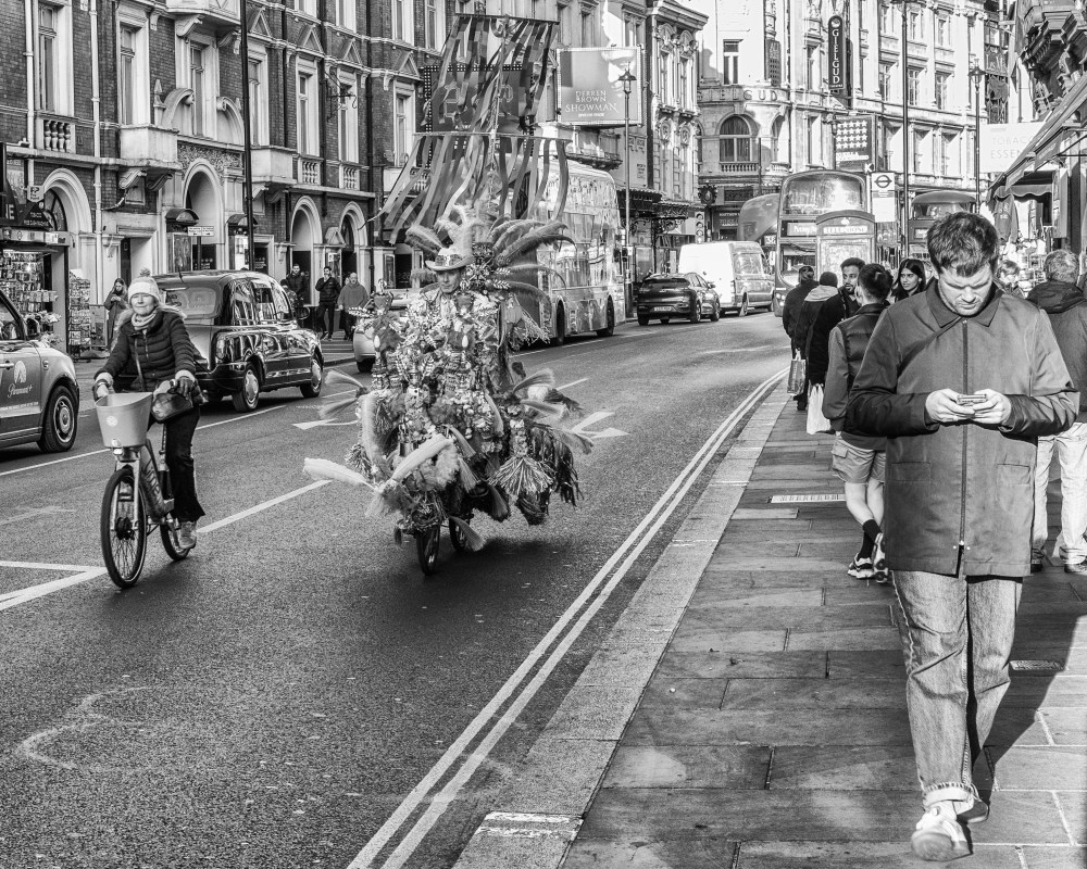 To illustrate what Meyerowitz means I’ve create a black and white version of the above colour image below. The immediate thing you notice is that the colourful cyclist at the centre of the image has really merged with the other two main subjects (i.e. the woman on the bicycle to the left and the man looking at his mobile phone on the right). If anything the man with the mobile phone, because he is further forward and not centre of the image has become the main subject. Clearly this was not the intent of the image. The cyclist bedecked in ribbons and feathers was meant to be the main pint of interest for this photograph.