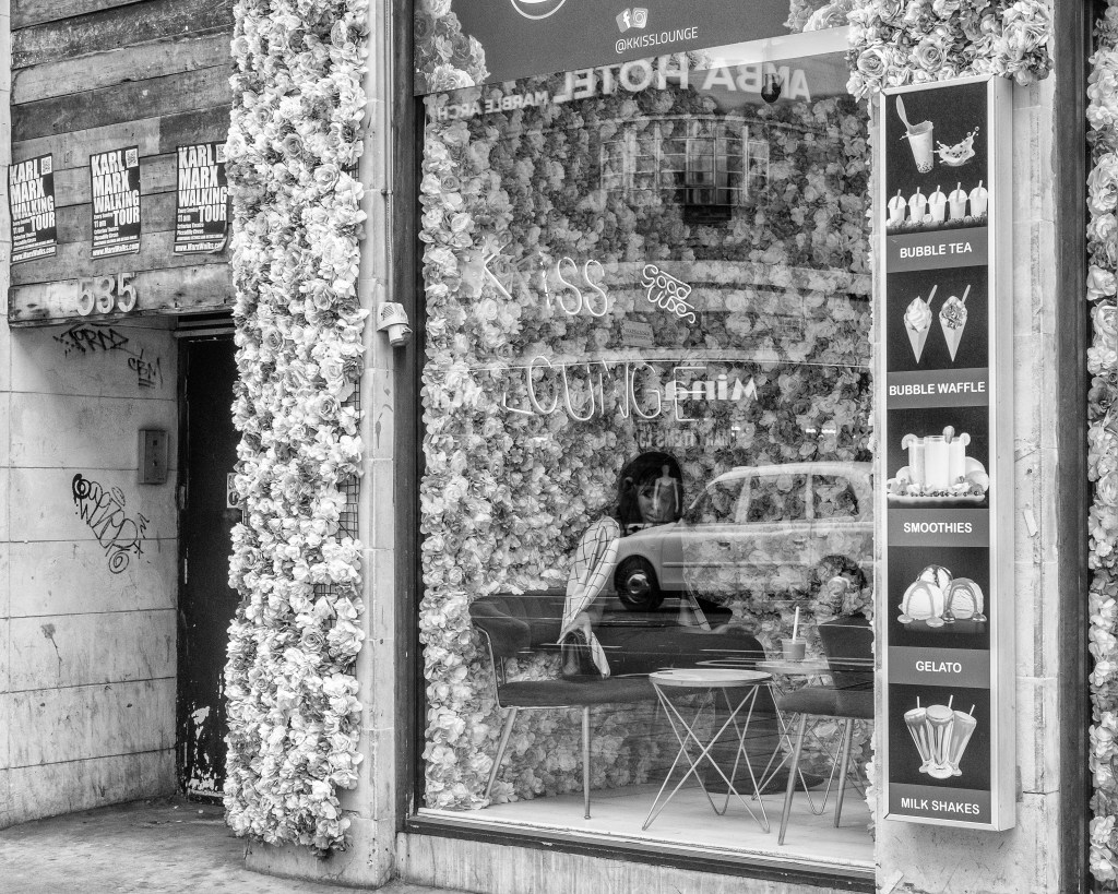 For this image I am less sure if colour adds anything. Whilst it may seem that the flowers around the window would need to be in colour you will see that they are basically in three colours pink/purple which render as a shade of grey in the black and white image, and white. The real area of interest in this photograph is the woman sitting inside the lounge. Being surrounded by colour detracts from that somewhat.
