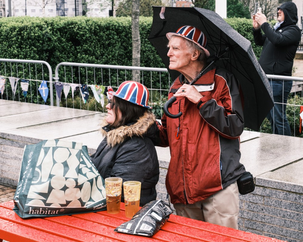 In this picture I was in my local stomping ground, Birmingham ,UK, in this instance photographing the crowds who had turned out to watch the kings coronation on a big screen in the city centre. This being Britain, it was raining but that did not stop die-hard royalists like this couple who had come prepared. They had their brollies, their Union Jack bowler hats as well as beers and a packet of crisps. Could it be any more British?