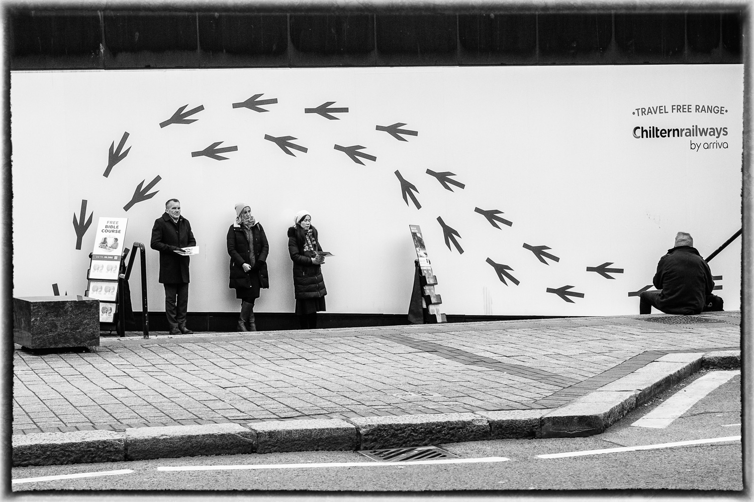 The above image was taken after a long day walking the streets of Birmingham which, as my home city, is a place I have frequented a lot over the years. Many days trudging the streets of Birmingham have resulted in precisely zero keeper images. This picture was taken right at the end of the day just as I was walking to the station to catch the train home. The three bible course promoters standing under chicken footprints walking over these people reminded me of what many of us do by skirting around such folk, avoiding any eye contact that may cause them to try and engage us in a conversation. To me, the picture had something to say and was my reward for putting in the time that day.