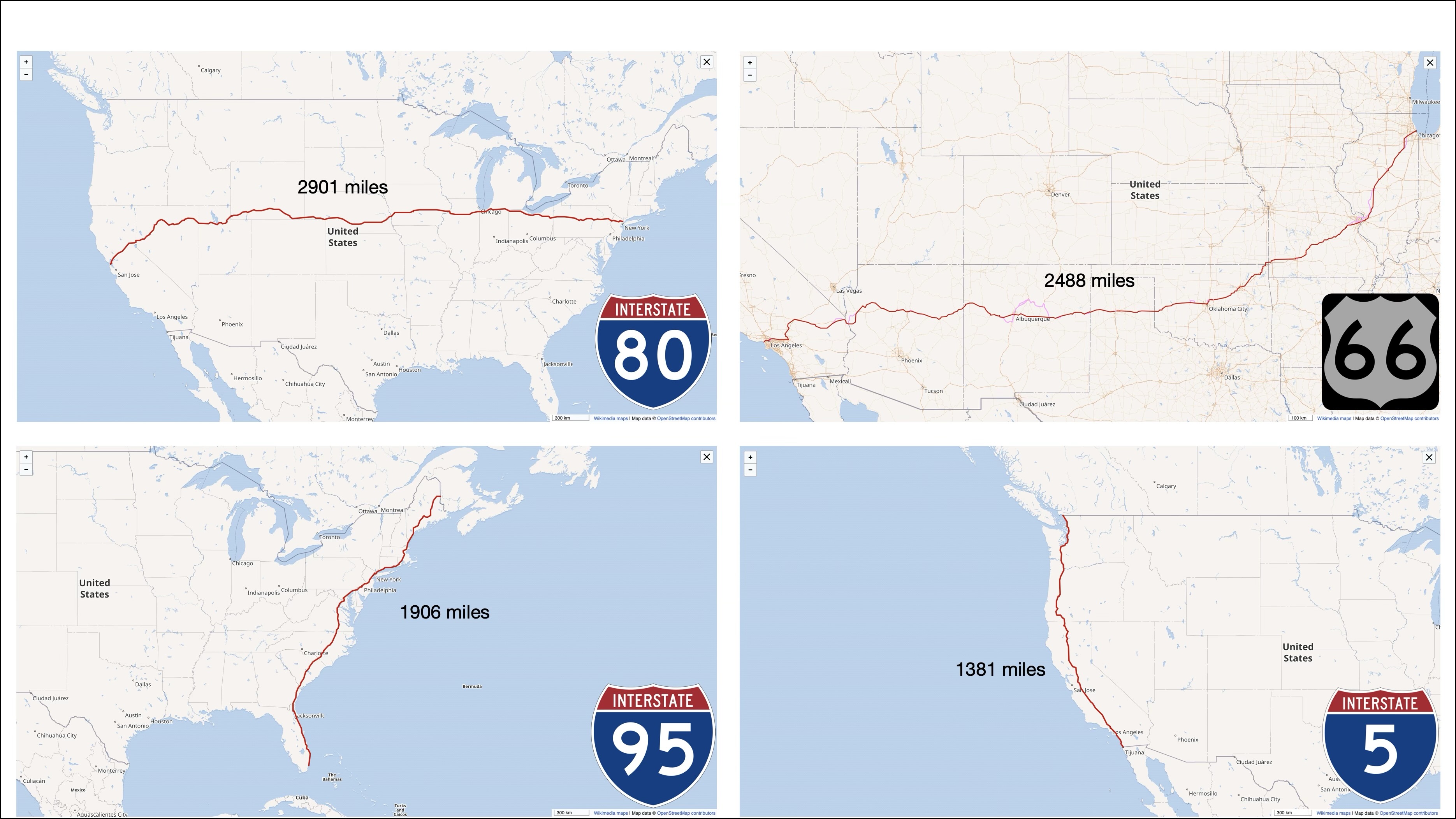 There are many roads in the US that qualify for supporting such an adventure. Route 66, which runs from Chicago to Los Angeles, is 2488 miles. Interstate 5 is the main north–south highway on the West Coast. It covers a distance of 1381 miles from Blaine in Washington state to the Mexican border in San Diego. Interstate 95 is the main north–south road on the East Coast. It runs from Miami, Florida, to the Houlton–Woodstock Border Crossing between the US and Canada, a distance of 1906 miles.